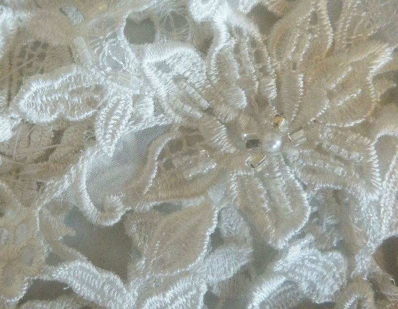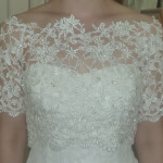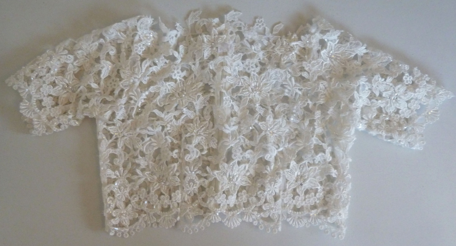 ビーズがついたウェディングドレスのトップ ビーズ刺繍が施されたレースのトップです。 すでに購入されていたウェディングドレスに合うレースのトップをお作りしました。 上から被るタイプの物で、開きはありません。 写真をクリックしてください。